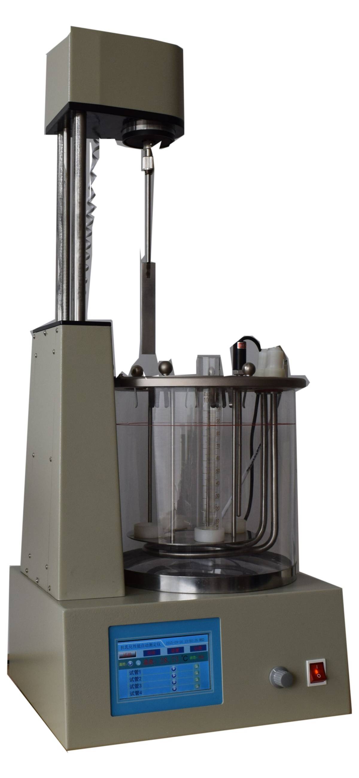 SH122石油破抗乳化测定仪用于测定石油合成液与水分离的能力。符合GBT 7605-1987 运行中汽轮机油破乳化度测定法和GB-T 7305-2003 石油和合成液水分离性测定法,恒温浴采用小缸体,操作简便,测量准确,外型设计美观,是国内**推出新型仪器。仪器主要技术指标:●盛样孔:3个●控温范围:室温~100℃●控温精度:±0.5℃●定时范围:0~99分钟任意设置●电源电压:AC220V±10%●频 率:50HZ±5% 仪器主要特点:●液晶屏幕中文显示人机对话界面,对预置温度、试验时间等参数,具有菜单提示式输入;●屏幕显示控温数值、自动计时、显示年月日及当前时钟等参数;●自动搅拌,自动定时,试管搅拌电机大臂自动升降;